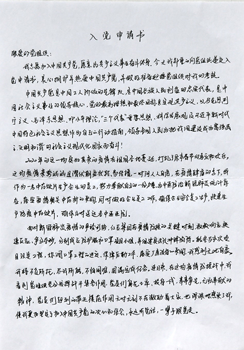 紅豆集團(tuán)國際公司的員工梁艷的再次向黨組織遞交入黨申請書的原因很簡單,“為了支持一線疫情防控,集團(tuán)緊急組建黨員突擊隊(duì)支援防護(hù)服、口罩生產(chǎn)線,負(fù)責(zé)最緊急、最艱苦的工作。我也報(bào)名了,因我還不是黨員,所以沒有把最重的任務(wù)安排給我。”受到身邊黨員的激勵(lì),讓梁艷鼓起勇氣,擬出了這份“疫情火線入黨申請書”。