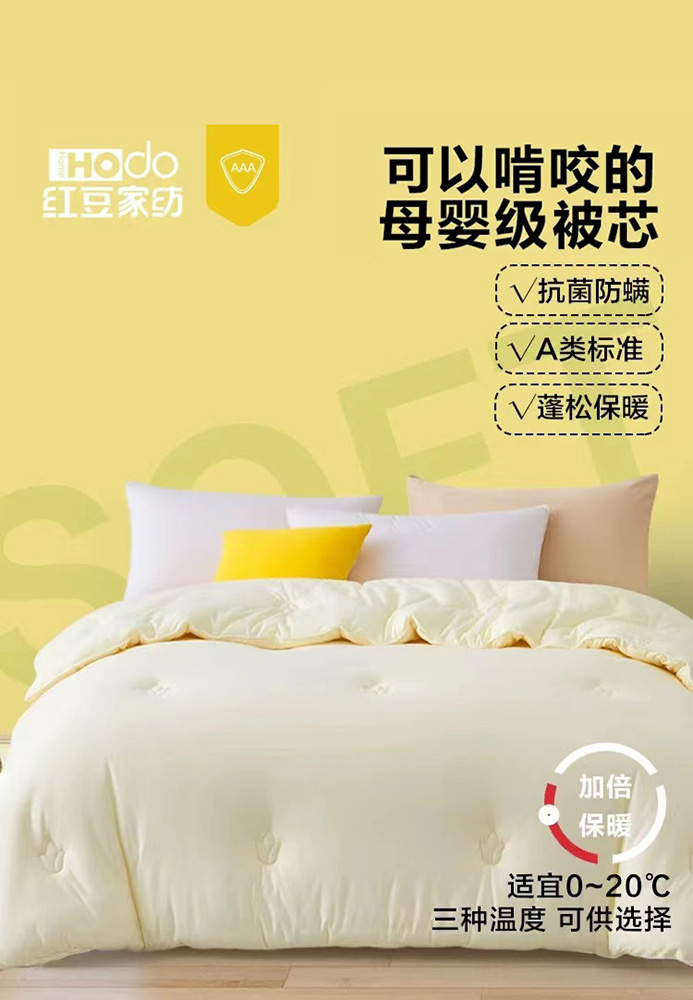 ? ? ? ? 紅豆家紡有限公司是紅豆集團子公司之一,自1998年成立以來,紅豆家紡不斷推進品牌建設,實現(xiàn)轉型升級,逐漸形成了HOdo紅豆家紡連鎖專賣、電子商務、家紡生產(chǎn)、小商品四大產(chǎn)業(yè)布局。多年來,紅豆家紡榮獲了“十大環(huán)保家紡品牌”、“中國最具流行魅力家用紡織品品牌”、“新銳時尚品牌”和“全國紡織實施卓越績效模式先進企業(yè)”等榮譽。紅豆家紡始終堅持“品質至上”,集設計、生產(chǎn)、銷售于一體,以“親情、愛情、友情”為品牌的核心理念,積極打造“溫馨、經(jīng)典、時尚”的家紡產(chǎn)品。產(chǎn)品涵蓋家居產(chǎn)品全系列,被芯系列、套件系列、枕芯系列、婚慶系列、絨毯系列、床墊系列、夏涼系列等上千種產(chǎn)品,以滿足家居紡織品一站式的消費方式。